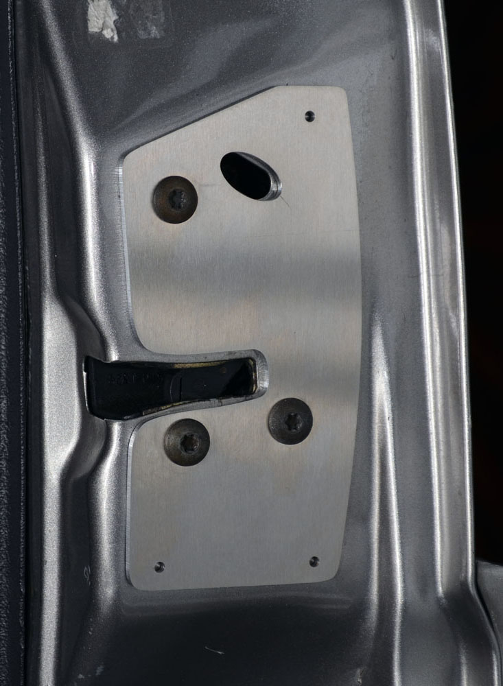 This is the door plate with replacement bolts for the 94-01 Dodge Ram (BR). This plate, machined out of 1/8" 6061 T6 aircraft grade aluminum, will allow you to repair the door and reinforce the door latch area without body work. This plate comes with 3 longer and stronger bolts to replace the 3 stock bolts which this version of the plate accommodates. In addition there are an additional 3 holes for screws or rivets for further reinforcement.